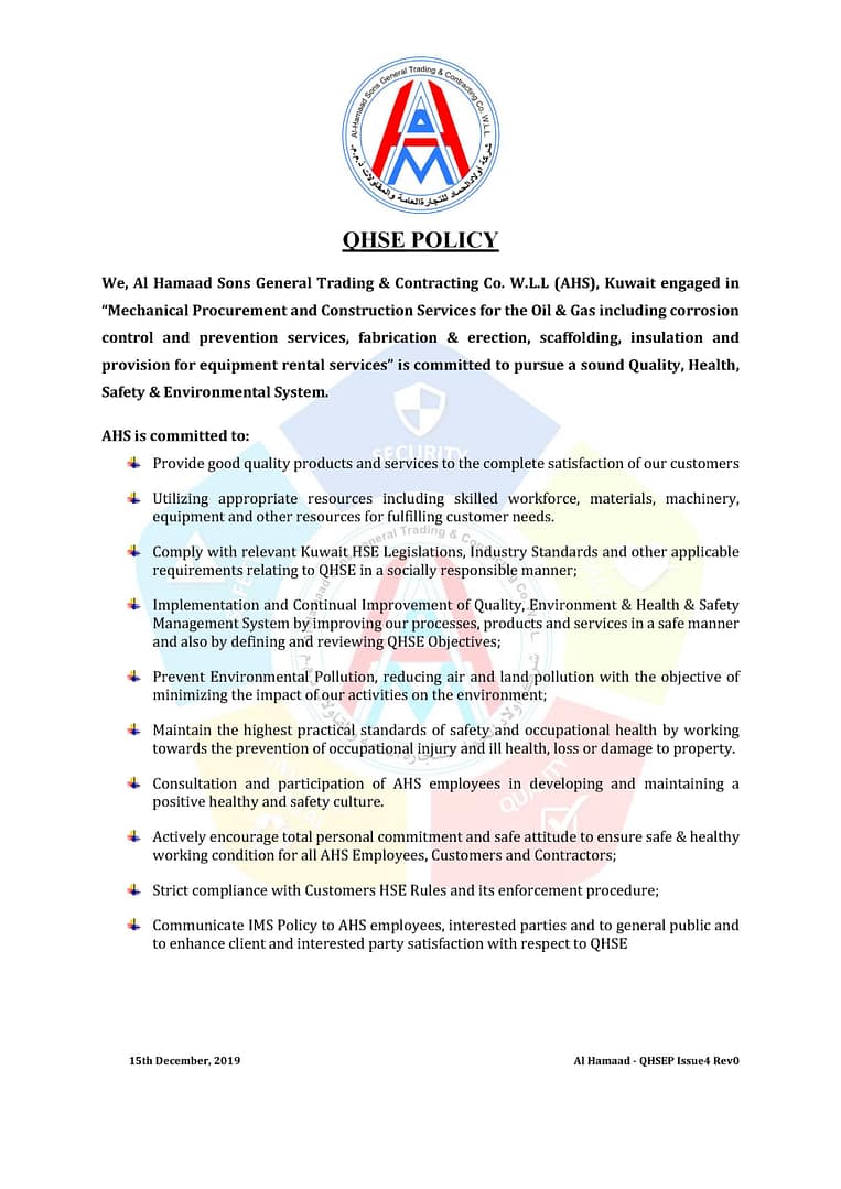 We are approved by KOC, KNPC, KGOC & KIPIC for mechanical procurement & construction (Oil & Gas).